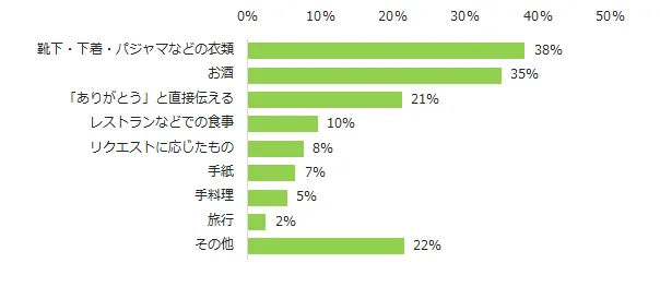 父の日は「靴下・下着・パジャマなどの衣類」(38%)、「お酒」(35%)が人気でした。「その他」(22%)と回答した方の多くは、ゴルフ用品や健康食品をプレゼントするようです。それぞれを選んだ方のコメントもご紹介します。