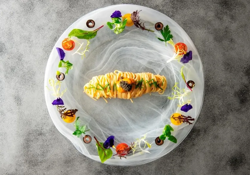 「冷製パスタフェデリーニ 生雲丹ソース キャビアを添えて」