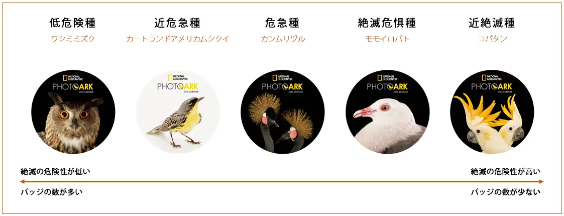 一部書店ではプロジェクト応援バッジをお付けしています。バッジは全部で5種類あります。IUCN(国際自然保護連合)のレッドリストに掲載されている、絶滅の危険性が高い種から低い種までをそれぞれバッジにしました。絶滅の恐れがもっとも高い「近絶滅種」はバッジの数を少なく、現状では危険性が比較的低い「低危険種」はバッジの数も多く作成しています。ジョエル・サートレイの美しい鳥の写真のバッジをつけて、ぜひ撮影プロジェクトを応援してください。