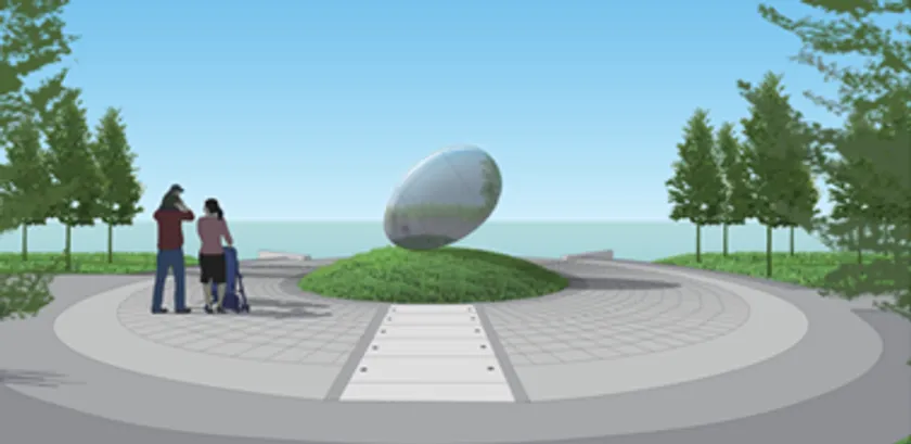 モニュメント制作にあたっては、防災緑地利活用検討委員会のアドバイザーである東京藝術大学の3教授がデザイン。「通常ではその形で静止できないところから生きるエネルギーを表現する卵型」に決定しました。
