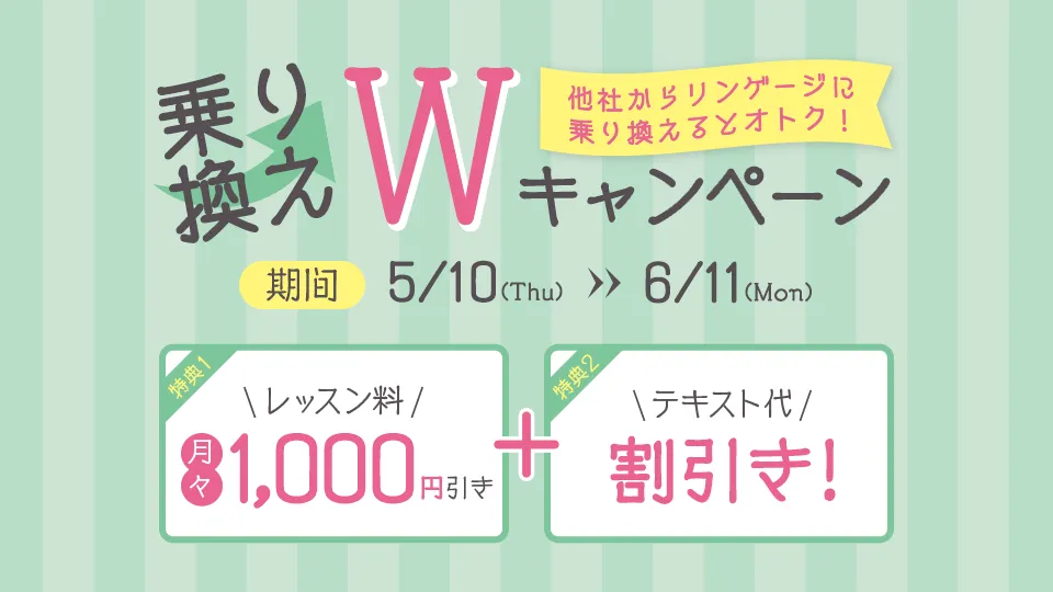 業界最安値の完全月謝制英会話スクール『英会話スクール リンゲージ』では、5月10日(月)より『乗り換えWキャンペーン』が始まります。