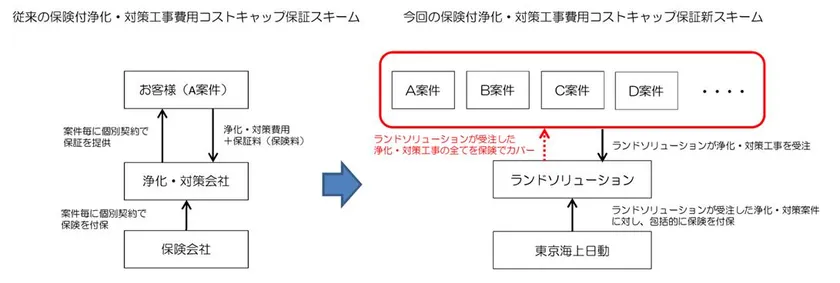 「ランドソリューション」では、このような従来型の損害保険活用コストキャップ保証の弱点を補うため、国内最大手損害保険会社である「東京海上日動」と共同でコストキャップ保証に関する保険商品を開発し、ランドソリューションが受注する全ての浄化・対策工事を包括的に損害保険を手当することにより、設計・契約までに要する時間の短縮、及びお客様の直接的な保険料負担のない形での保証バックアップを可能としました。