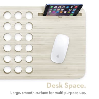 MacBookを置く下には通気口を配置、また素材であるバンブーが一部の熱を吸収することで熱を逃がす排熱性を実現しています。また、iPhoneやiPadなどが置けるDuck(切り込み)を配置、人間工学に基づく設計により実用性にも優れています。
