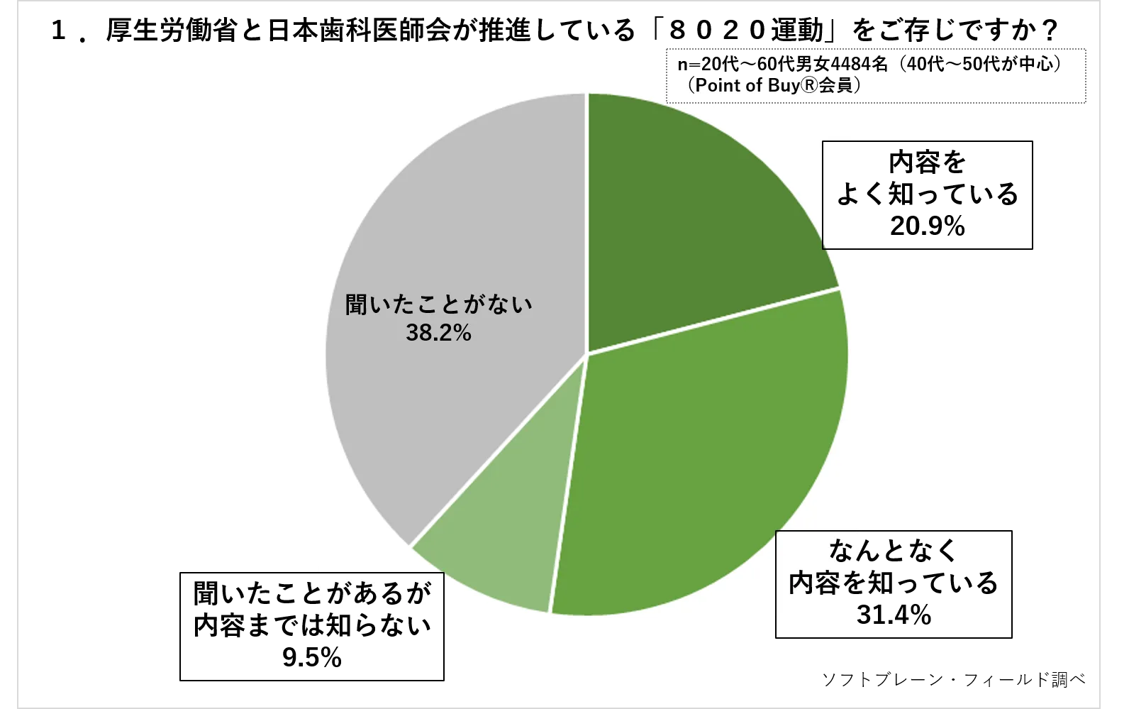 最初に、平成元年より厚生労働省と日本歯科医師会が推進し、今年30周年を迎える「8020運動(※)」についての認知調査をしました。※「80歳になっても自分の歯を20本以上保とう」という運動です。