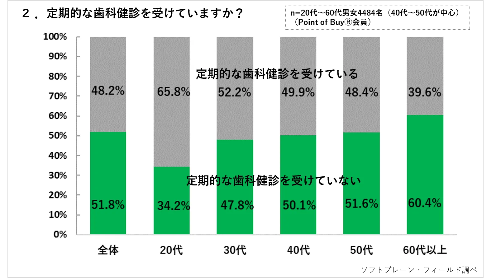 一方で20代、30代では定期的な歯科健診を受けていない方のほうが多く、20代は受けていない方が6割を超える結果となりました。