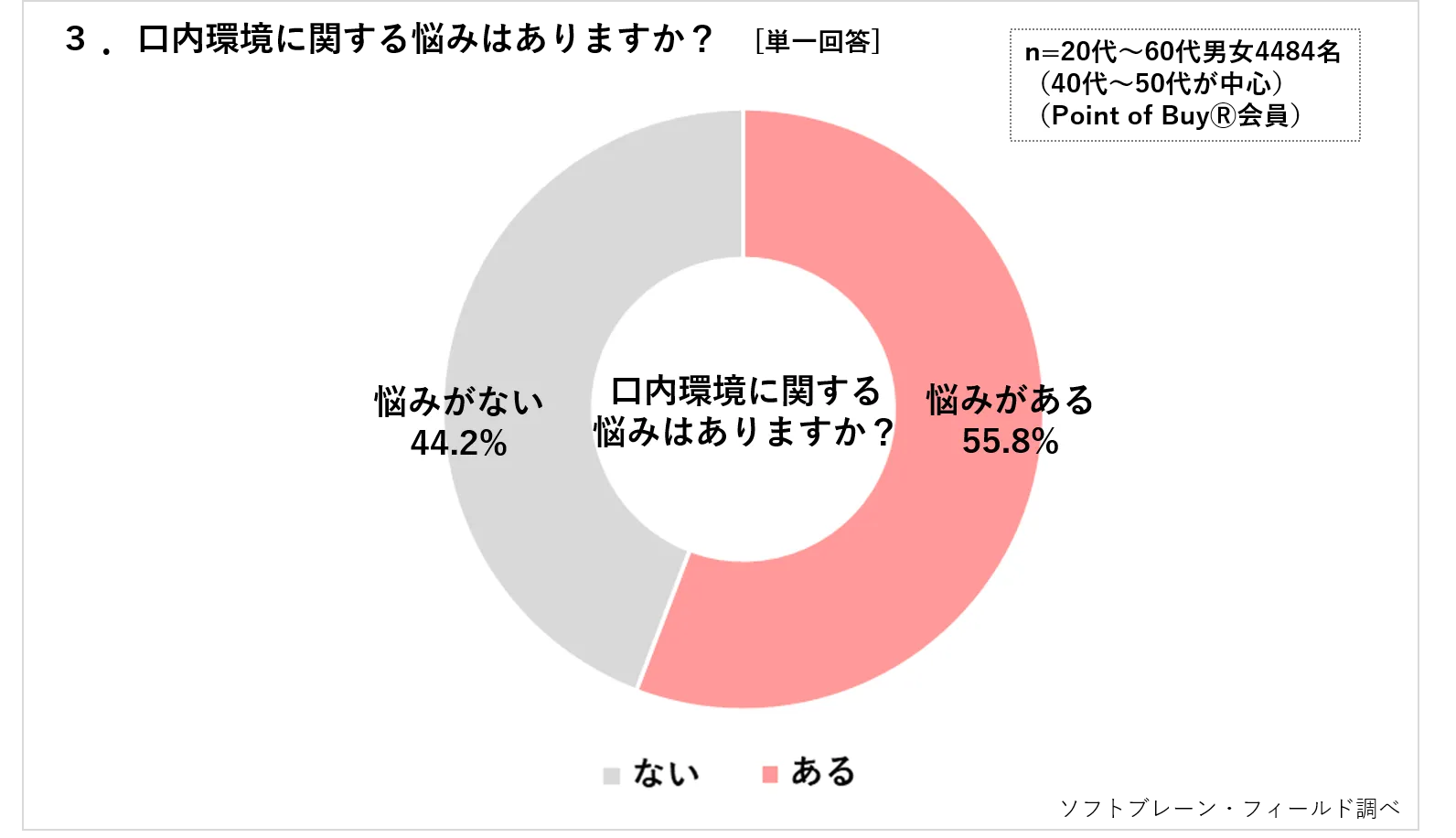 口内環境に関する悩みについては、半数以上の55.8%が「悩みがある」と回答しました。(n=2503名)