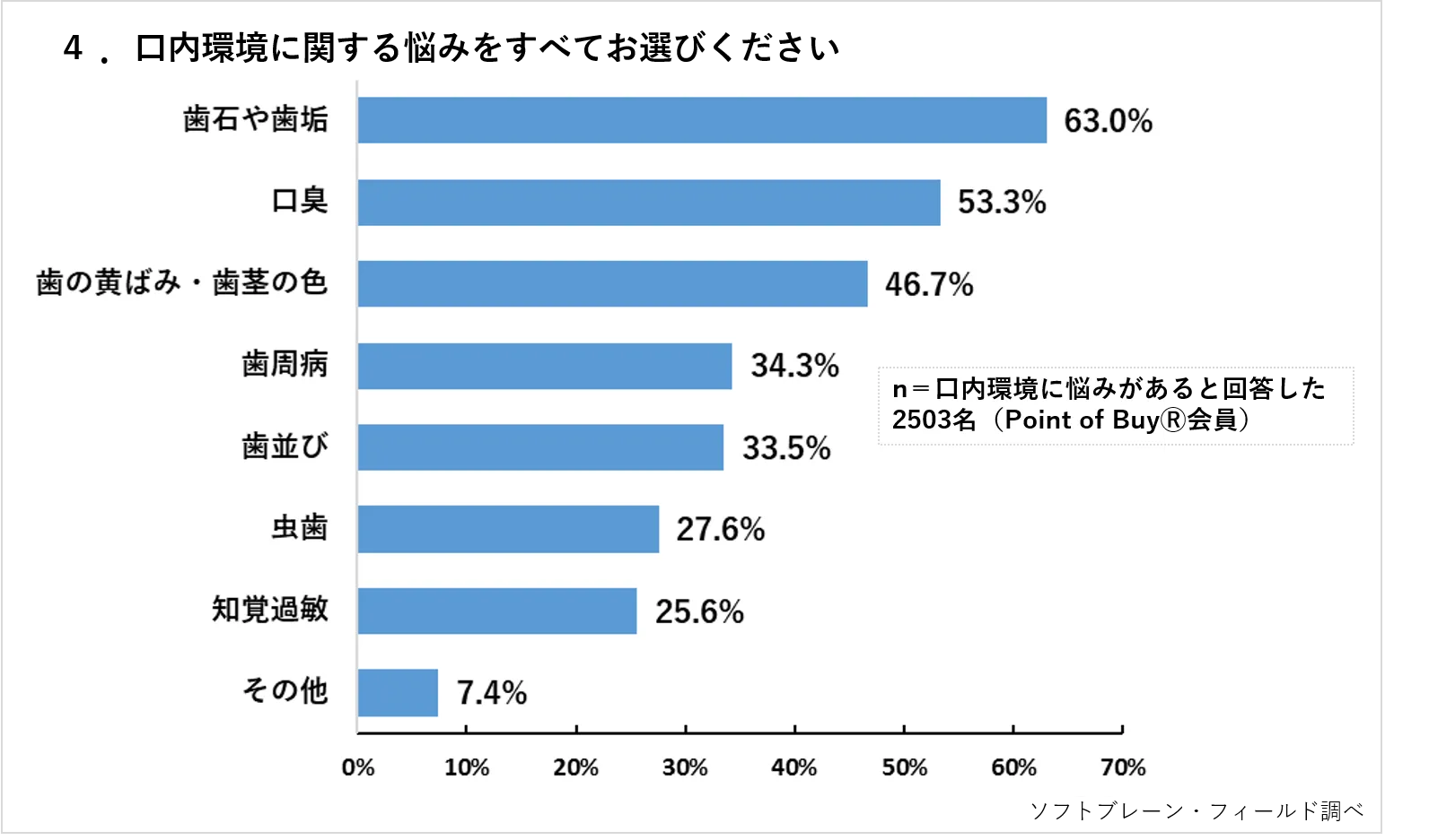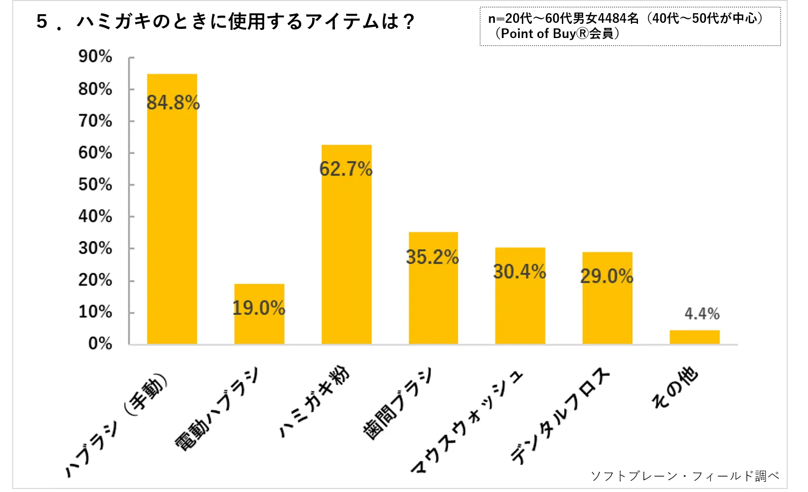 毎年6月4日は「6(む)・4(し)」にちなんで日本歯科医師会が「むし歯予防の日」として制定しており、6月4日から10日までの1週間は、「歯と口の健康週間」を実施しています。それを受けて、フィールド・クラウドソーシング事業を展開するソフトブレーン・フィールド株式会社(本社:東京都港区、代表取締役社長:木名瀬博)は、「マルチプルID-POS購買理由データPoint of Buy(R)」(以下POB)アンケートモニター(n=4484名 男女40代~50代中心)を対象に、「オーラルケアに関する調査」を2018年4月12日(木)~4月16日(月)にかけて実施しましたので、報告いたします。(調査概要は4Pに記載)