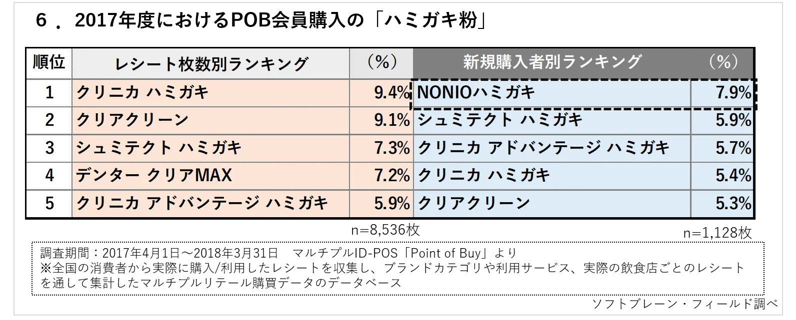 では、どのようなハミガキ粉のブランドが売れ筋なのでしょうか。2017年度における当社収集のレシートデータ(POB)の「ハミガキ粉カテゴリ」で調査をしました。