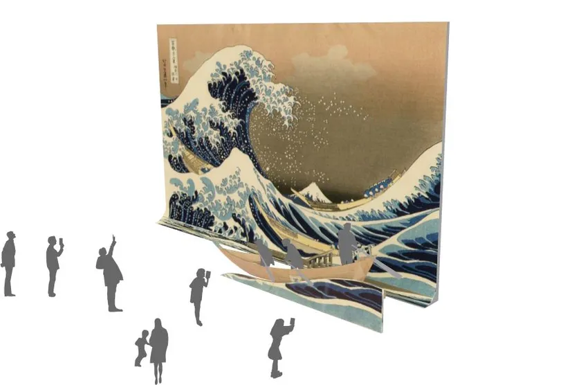 高さ約7.5メートルの特大スクリーンに、画中の人物が原寸大になるように「冨嶽三十六景・神奈川沖浪裏」を拡大映像化。絵のなかの人物になりきってみると、大きな波が大迫力で迫ってくるはず。さらに、声の大きさで波がどんどん大きくなるインタラクティブな仕掛けによって、波の大きさを実感できます。