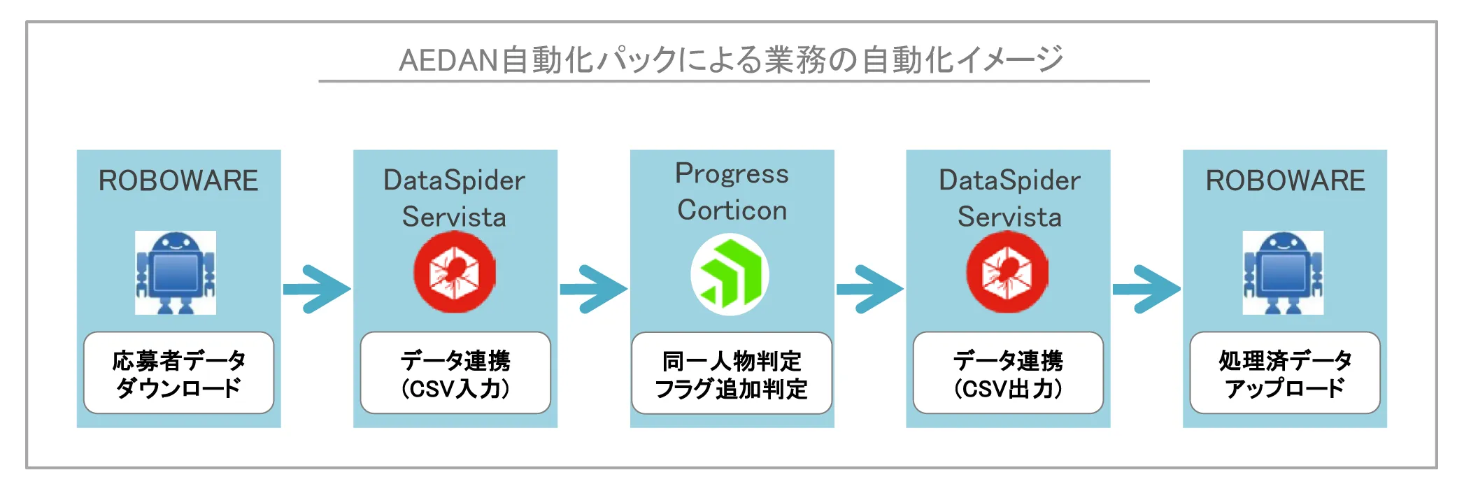 「AEDAN自動化パック」は、人の手作業を自動化する開発型RPAツール「ROBOWARE(販売元:株式会社イーセクター)」、RPAの実現に必要な周辺システムとのデータ連携を自動化するEAIツール「DataSpider Servista」、業務判断を自動化する推論型AI「Progress Corticon」を組み合わせた連携ソリューションです。例えば、(1)就職ポータルサイトからの応募者データのダウンロードをROBOWAREが自動化、(2)ダウンロードされた応募者データをDataSpider ServistaとProgress Corticonと連携して、同一人物判定やフラグ追加判定を自動化、(3)処理済みの応募者データをROBOWAREが採用支援システムにアップロードすることで全ての流れを自動化します。