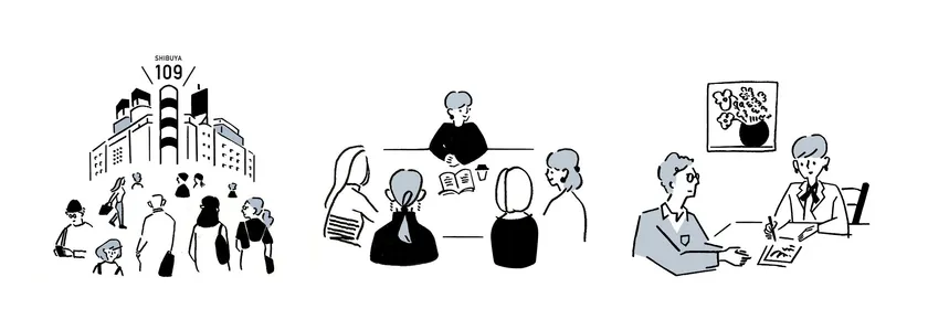 また、俯瞰の構図によって、若者やマーケティング事業にとってのクライアント、いずれかに偏ることのない中立的な存在の表現を目指しています。