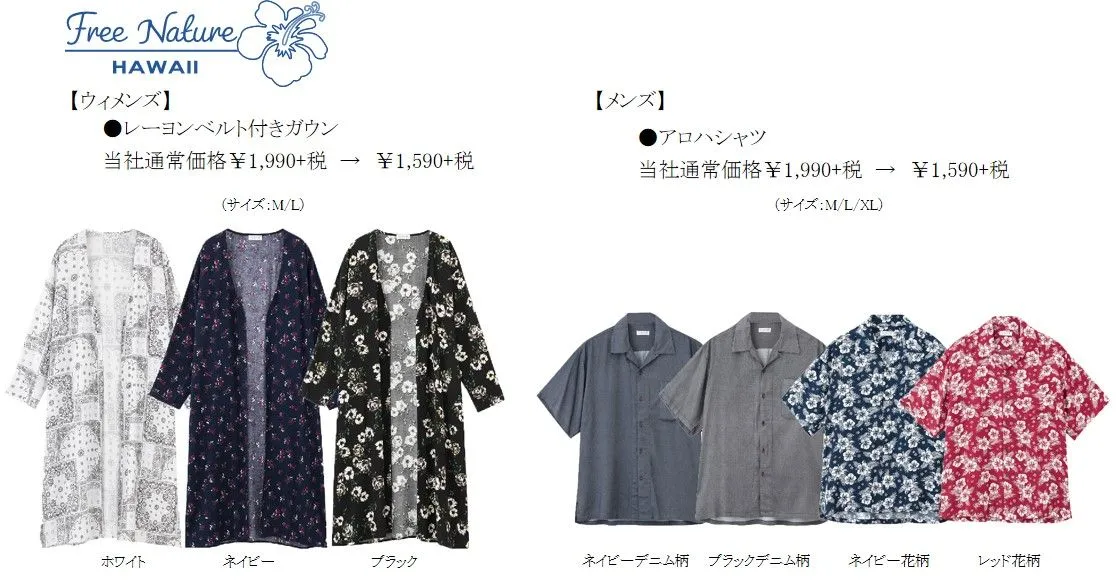 また今季注目のリラックススタイル「Free Nature HAWAII」からは、リゾートコーデをおすすめ。さらっと羽織るだけでリゾート感アップするウィメンズガウンや、夏感たっぷりのメンズのアロハシャツが早くもお試し価格でご提供します。