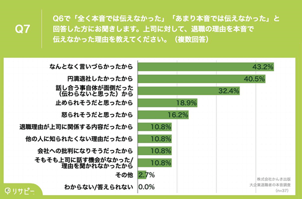 Q6で「全く本音では伝えなかった」「あまり本音では伝えなかった」と回答した方に、「Q7.上司に対して、退職の理由を本音で伝えなかった理由を教えてください。(複数回答)」(n=37)と質問したところ、「なんとなく言いづらかったから」が43.2%、「円満退社したかったから」が40.5%、「話し合う事自体が面倒だった(伝わらないと思った)から」が32.4%という回答となりました。