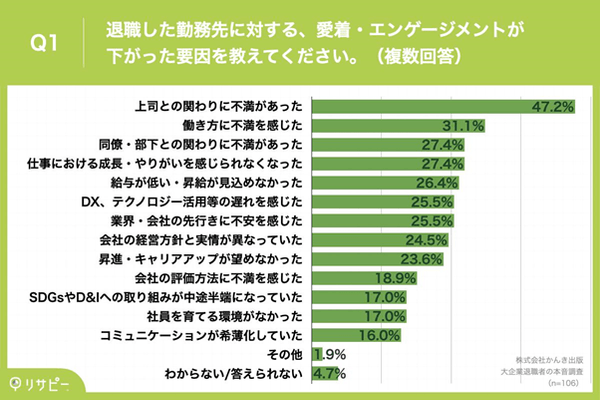 「Q1.退職した勤務先に対する、愛着・エンゲージメントが下がった要因を教えてください。(複数回答)」(n=106)と質問したところ、「上司との関わりに不満があった」が47.2%、「働き方に不満を感じた」が31.1%、「同僚・部下との関わりに不満があった」が27.4%という回答となりました。