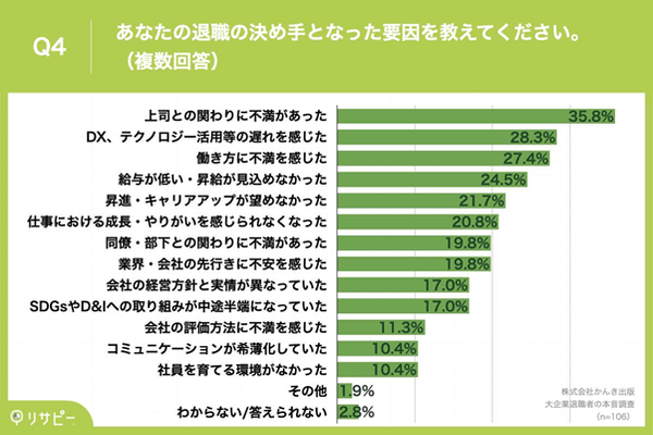 「Q4.あなたの退職の決め手となった要因を教えてください。(複数回答)」(n=106)と質問したところ、「上司との関わりに不満があった」が35.8%、「DX、テクノロジー活用等の遅れを感じた」が28.3%、「働き方に不満を感じた」が27.4%という回答となりました。