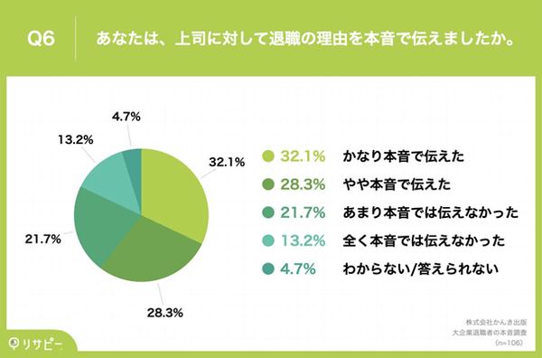 「Q6.あなたは、上司に対して退職の理由を本音で伝えましたか。」(n=106)と質問したところ、「あまり本音では伝えなかった」が21.7%、「全く本音では伝えなかった」が13.2%という回答となりました。