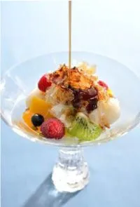 白玉やフルーツとともに盛り付け、黒蜜をかけてお召し上がりいただきます。