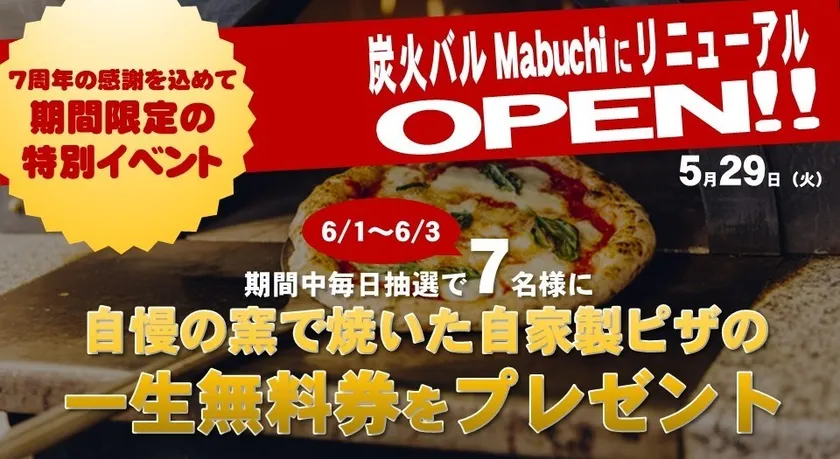 浜松の炭火バルが7周年を機に5/29リニューアル 「自家製ピザの一生無料キャンペーン」を6/1~6/3実施