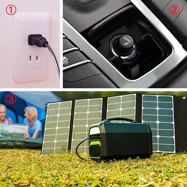 iForway PS300の再充電は、AACコンセント、シガーソケット、ソーラーパネルからの3種類の充電方法により充電ができます。