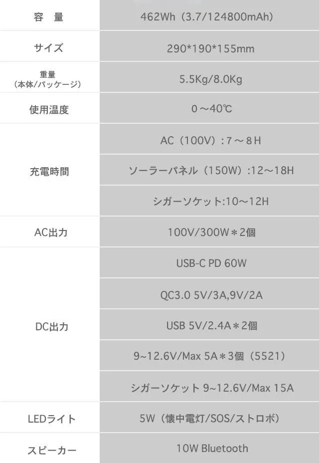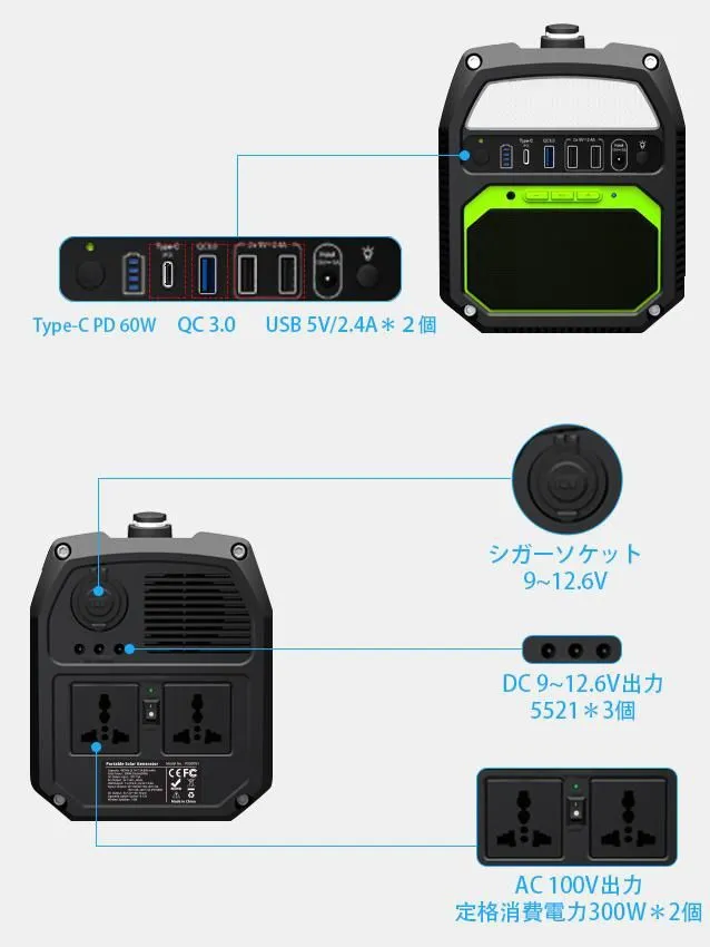 iForway PS300は、約500Wh(3.7V/124800mAh)の大容量のポータブル電源であり、USB、シガーソケットなどDC電源を備えている他、定格消費電力300WまでのAC出力もあり、いつでもどこでも使用することができます。
