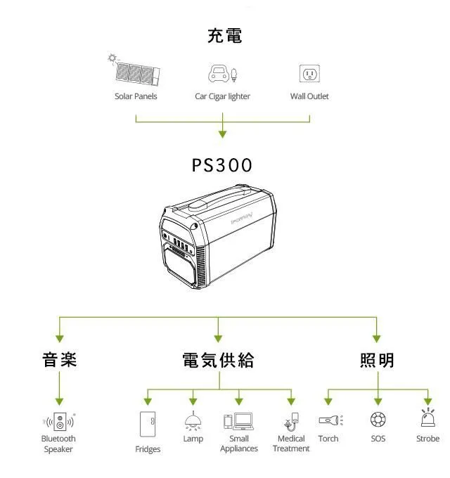 iForway PS300は、蓄電式電源であり、ソーラーパネル、シガーソケットまたAC電源から充電することができ、様々な端末や電気製品に電気を供給する他、スピーカーとLEDライトも付いている為、音楽を再生したり照明としても機能します。