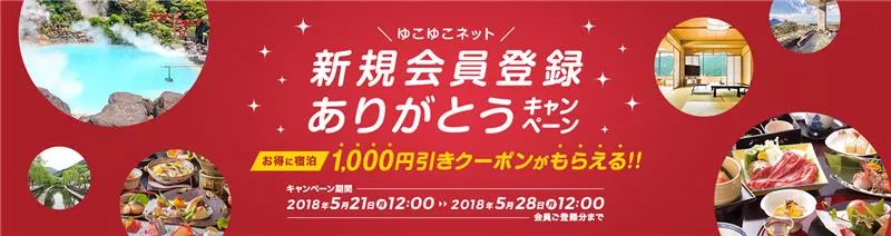 宿泊予約サービスを提供するゆこゆこホールディングス株式会社(本社:東京都中央区、代表取締役社長:池照 直樹)は、2018年5月21日(月)から5月28日(月)の期間中、温泉旅館・ホテル予約サイト「ゆこゆこネット」(http://www.yukoyuko.net/)において「新規会員登録ありがとうキャンペーン」を実施いたします。