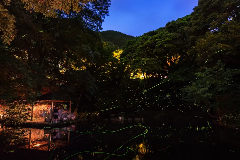 元県議会議員木村家の別邸「大川竹ヶ沢公園」は、自然庭園で「静岡県のみずべ100選」に選ばれています。移りゆく季節の息吹を感じ、ゆったりと流れていく時間を楽しめる園内には、6月になると清流にほたるが舞います。幻想的に舞うほたるの光が公園の池の水面に映り込み、さらに美しい光景が広がります。