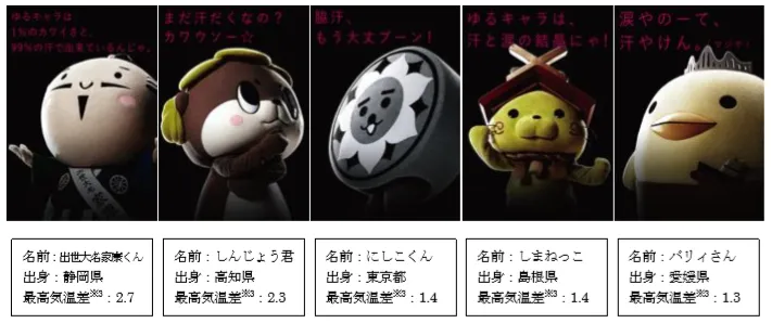 日本で特に暑くなっている地域の1つである静岡からは「出世大名家康くん」、高知からは「しんじょう君」、東京は「にしこくん」、島根からは「しまねっこ」、愛媛から「バリィさん」が参加します。また、特設サイト内では、暑さに負けず頑張る各ゆるキャラのリアルなメッセージを訴えるビジュアルコンテンツをお楽しみ頂けます。