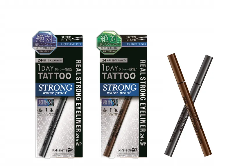 6年連続売上No.1アイライナー(※1)の「1DAY TATTOO」シリーズから、2017年5月に限定発売した超耐久ライナー「K-パレット リアルストロングアイライナー24hWP」が、ついに定番化して登場です。超耐久成分を高配合したこだわりの独自処方で、スポーツ・海やプール・アクティビティなど、どんなシーンでも描いたラインが崩れずにキープ(※2)します。