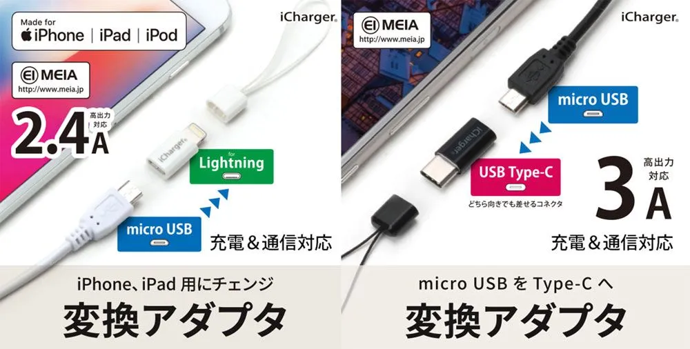 micro USBコネクタをそれぞれUSB-Type-C、Lightningに