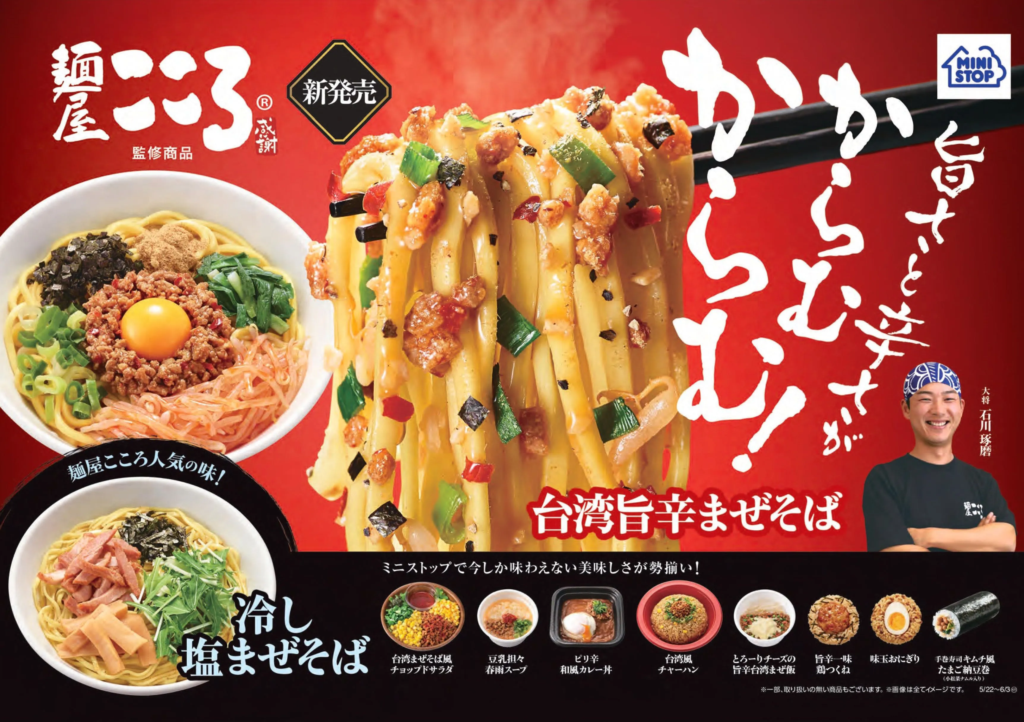 ミニストップ株式会社(本社:千葉県千葉市 代表取締役社長:藤本明裕、以下:ミニストップ)は、台湾まぜそば店「麺屋こころ」監修のまぜそばや冷し麺、おにぎり、サラダ、スープなど計10品を、2018年5月22日(火)より、全国のミニストップ(2018年4月末現在:2,247店)にて発売します。
