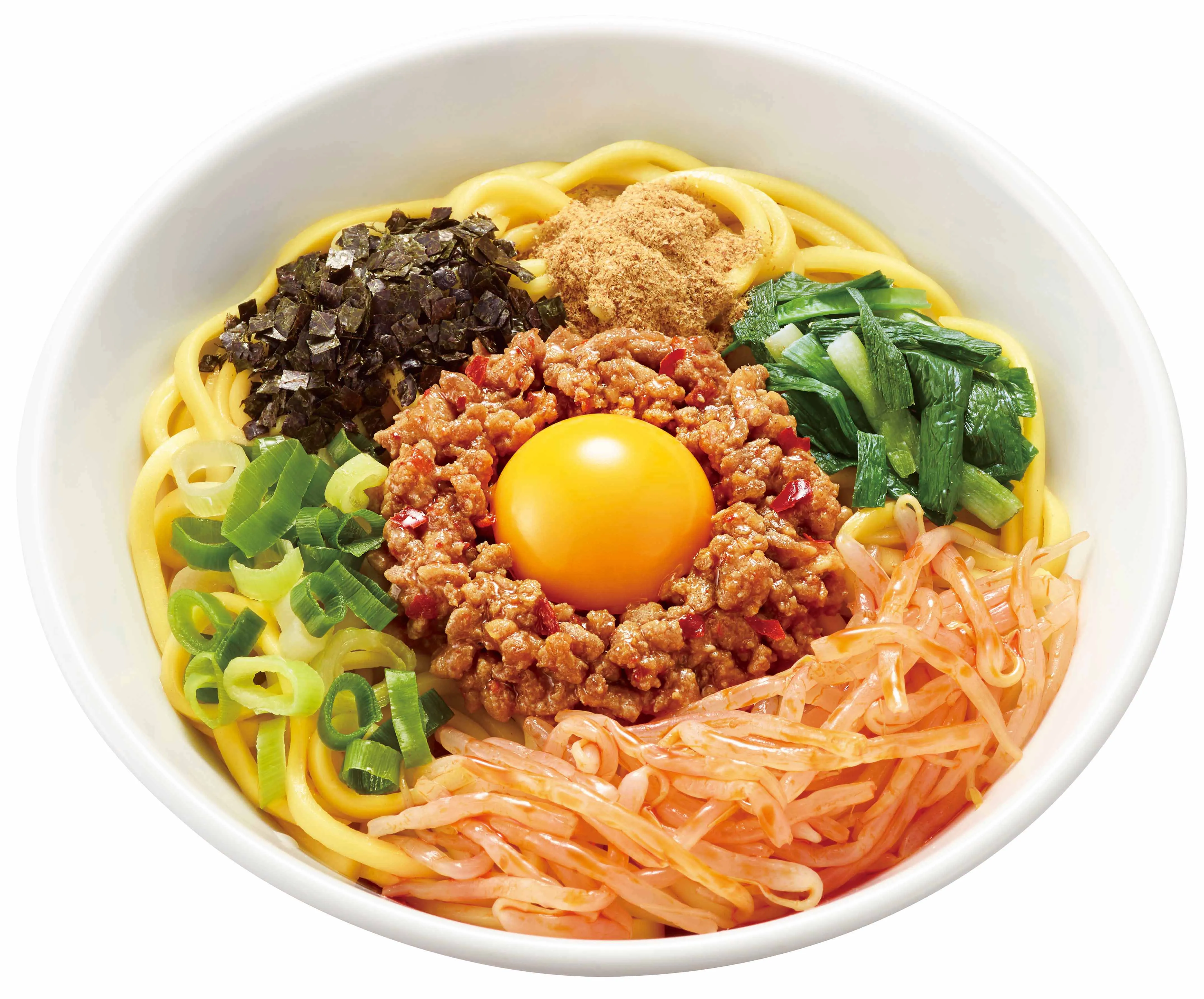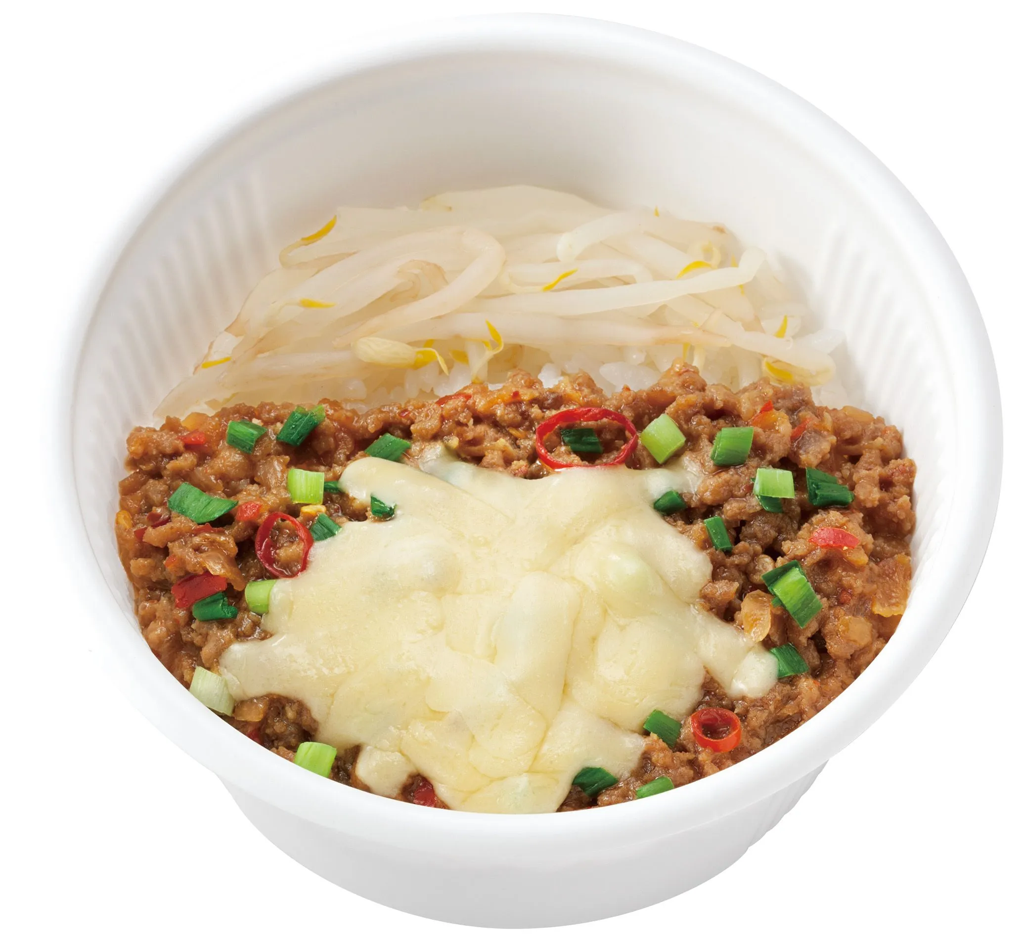 ピリ辛の肉そぼろ、たまごの黄身、刻み海苔、もやし、ニラに加え、女性に人気の「チーズ」をトッピングしたピリッとした辛さが楽しめるまぜ飯です。