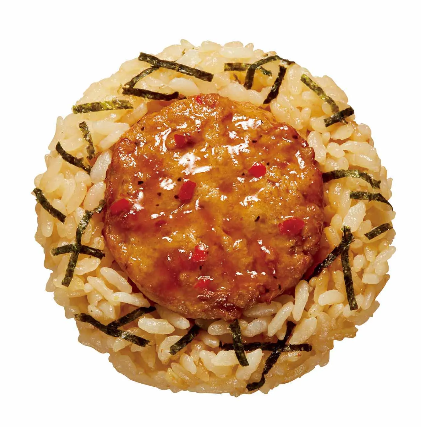軟骨入りの鶏つくねに、麺屋こころ特製の一味の効いたにんにく醤油たれをからめたおにぎりです。特製タレのぴりっとした辛さと、つくねの食感がクセになる味わいです。彩りに刻み海苔をトッピングしました。