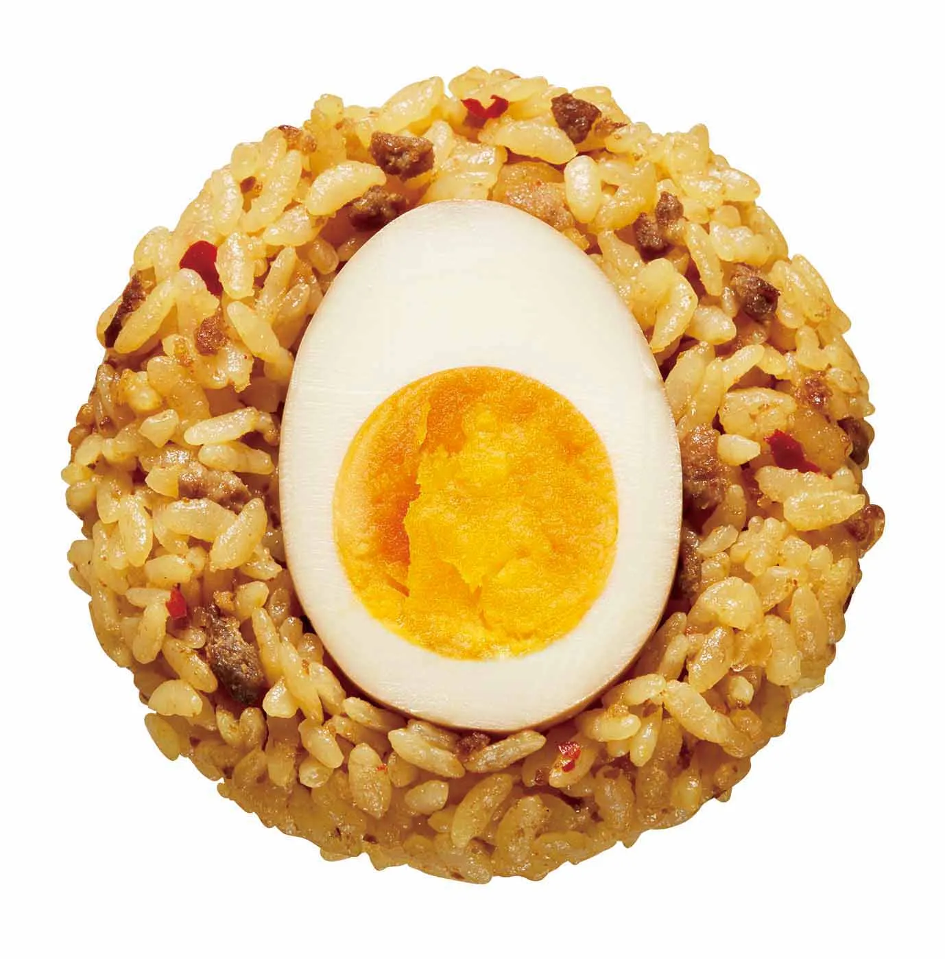 麺屋こころ名物のしめ“追い飯”をイメージしたおにぎりです。ピリ辛の肉そぼろを混ぜ込んだごはんに、醤油で味付けした玉子を1/2にカットしトッピング。濃いめの味付けのごはんと、まろやかな黄身玉子が相性抜群です。