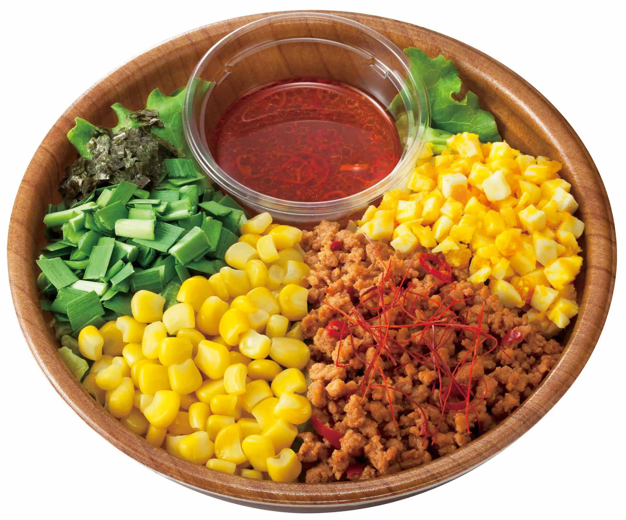 台湾まぜそばをチョップドサラダにアレンジ。台湾ミンチ、刻みのり、にらを組み合わせた、これまでにないサラダです。唐辛子とにんにくを効かせた醤油味のピリ辛ミンチ、特製ピリ辛オイルドレッシング等パンチのある味付けが後を引く、おつまみにもなるサラダです。