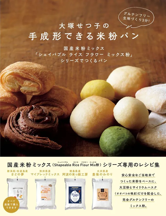 米粉パンの第一人者大塚せつ子が開発した「シェイパブル ライス フラワー ミックス粉」は、国内のそれぞれの地域で採れた安心安全なお米を使った「ご当地米粉」に、「大豆粉」と「サイリウムハスク」(インド産のオオバコの種皮を精製したもの)を配合したシンプルなミックス粉。