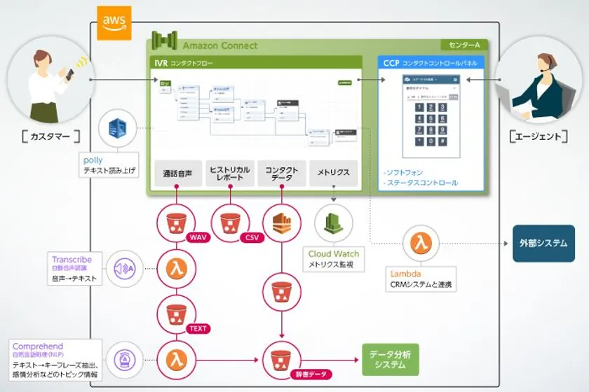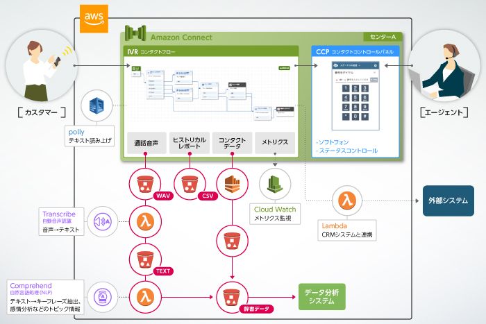 サーバーワークスは、Amazon ConnectとAWS Lambda・Amazon Transcribe・Amazon Comprehend・Amazon Lexなどを利用しデータ処理の設計および実装を担当いたします。
