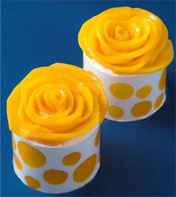 マンゴーの果肉で作った花を贅沢に盛りつけたショートケーキです。かわい らしいドット柄はマンゴーゼリーで表現しました。少し大きめのサイズは自 分へのご褒美やお土産にピッタリです。