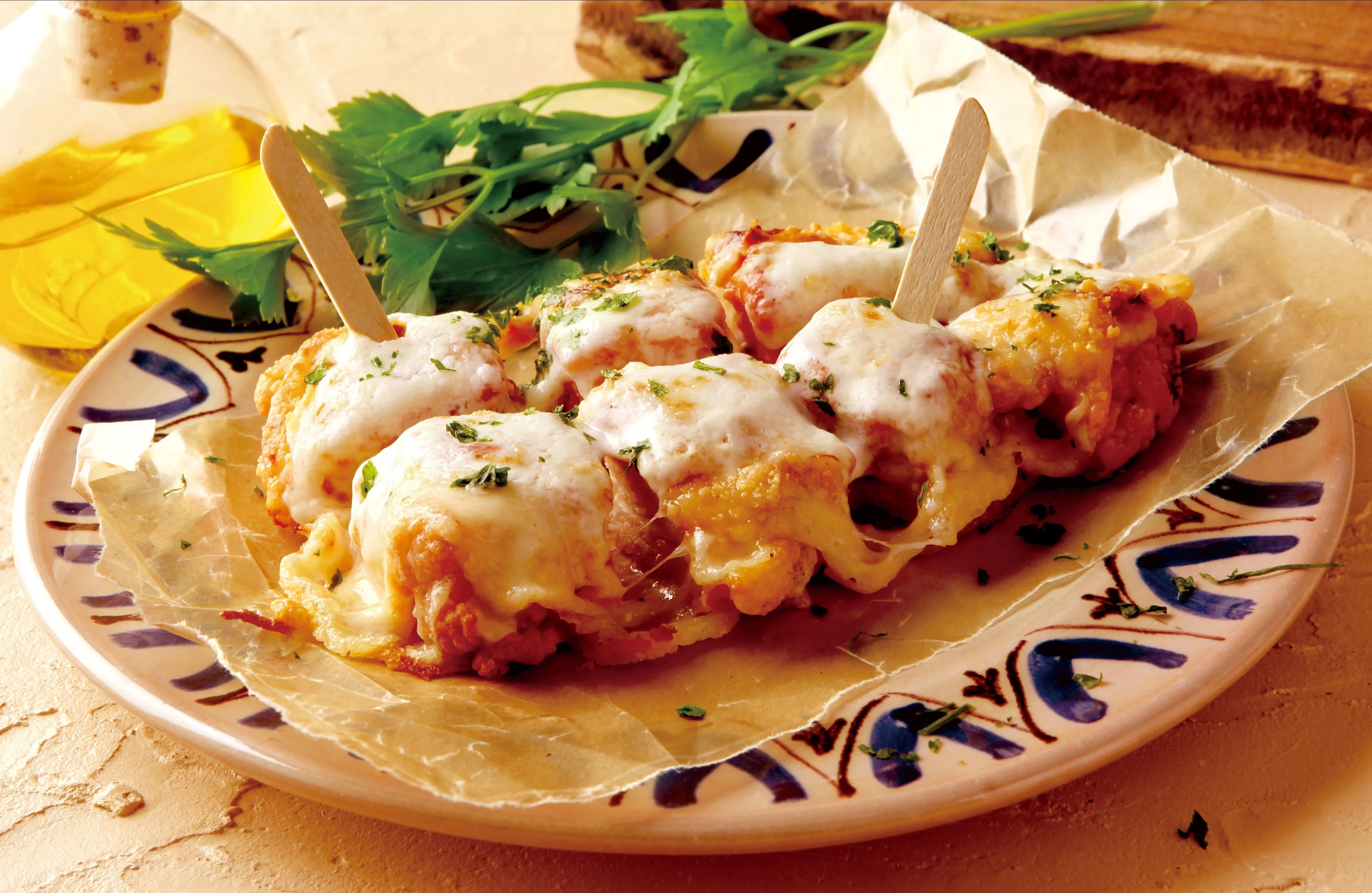 タパスの新作「クワトロチーズ・チキン」は、しっとりとジューシーなムネ肉を使用したフライドチキンに特製のトマトソースをたっぷりとかけ、北海道産マスカルポーネや熟成パルメザンチーズなど数種類のナチュラルチーズをかけ焼き上げた、ビバパエリアこだわりのオリジナルタパスです。