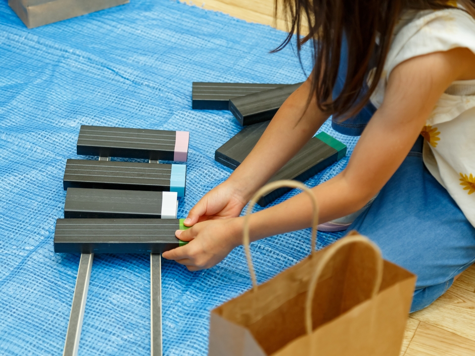 木琴づくりをする中で、「知る楽しさ」「作る楽しさ」「奏でる楽しさ」を感じながら、素材ごとの感触の違いを発見し、職人という仕事やものづくりへの興味をもつことを目的としています。工事で排出された端材を利用することで、子どもたちがSDGs を考えるきっかけを提供します。また、様々な素材の材料に触れることで、素材による感触や音色の違いの発見、おもちゃを自ら作れるという発見、ものづくりの楽しさを発見など、子どもたちに様々な「発見」の場を提供できるよう、企画しています。