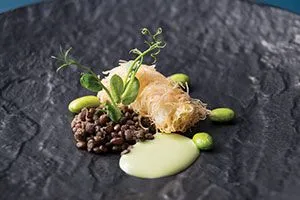 サクサクとしたラングスティーヌのカダイフ※は、目の前で注ぐ濃厚な枝豆スープと相性抜群。ゆっくりと火入れしたレンズ豆はブイヨンの旨味を含ませて。