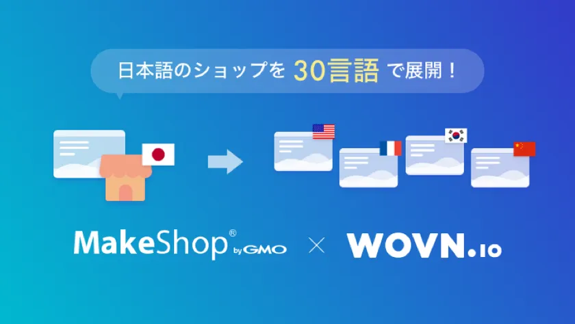 Wovn Technologies株式会社(所在地:東京都港区、代表取締役:林 鷹治、以下 Wovn Technologies)が提供する、WEBサイト多言語化開発ツール「WOVN.io(ウォーブンドットアイオー)」と、GMOメイクショップ株式会社(所在地:東京都渋谷区、代表取締役社長:向畑 憲良、以下 GMOメイクショップ)が提供する、ネットショップ構築サービス「MakeShop」が連携し、最大30カ国語に対応できる多言語のネットショップを構築できるサービスの提供を開始したことをお知らせいたします。