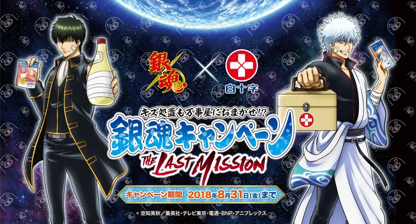 これまで実施を重ねるたびにご好評いただいてきたこの2者のコラボですが、このたび「THE LAST MISSION」とタイトルを冠した最後(!?)のキャンペーンを実施いたします。白十字「キズ処置シリーズ」の対象商品バーコードを集めて応募すると、キャンペーン限定の「銀魂」グッズや人気ゲーム機が当たる他、Twitter上でも簡単に応募ができるプレゼント企画を実施いたします。