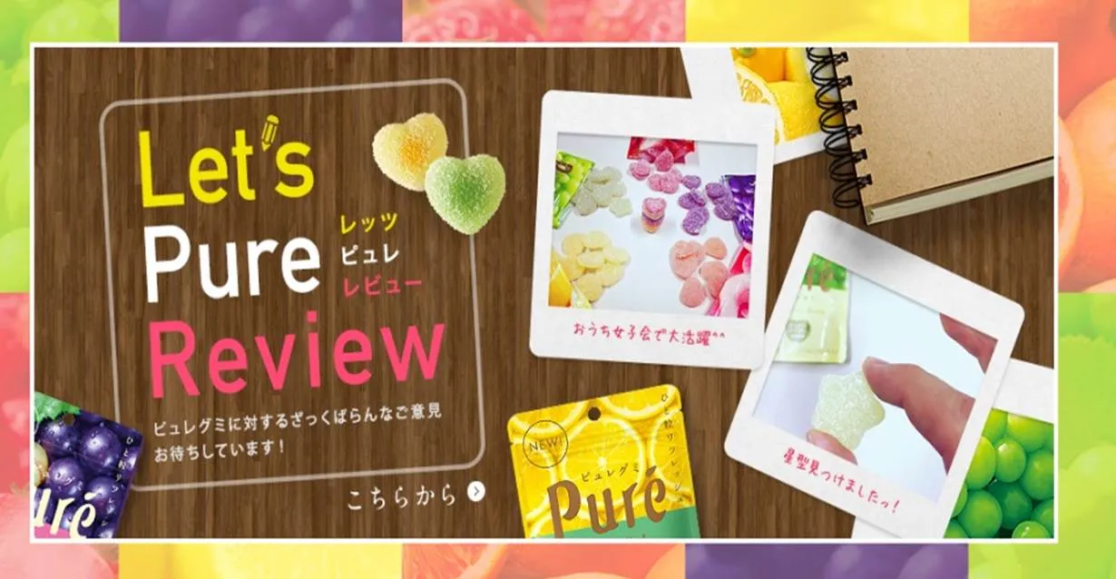 「ピュレコミ」では、“なんでもピュレ・レビュー””先行モニター“新商品お試しピュレゼンター”“をはじめ、ピュレグミファンとグミを楽しむ様々な企画を実施しております。https://www.kanro.jp/kanro/pure/