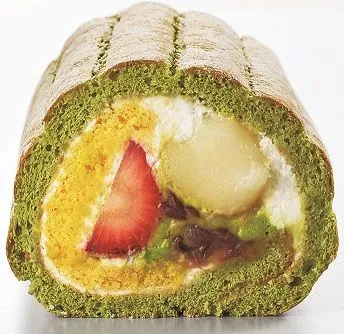 いちご、あずき、白玉などを抹茶のシャルロット生地で巻きました。