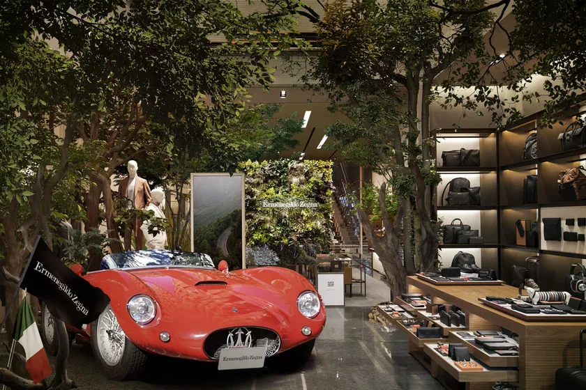 期間中の店内は、ブランド創業の地、イタリアのアルプス山麓に位置するトリヴェロにある「オアジ ゼニア」やトリヴェロとを結ぶ長さ14キロメートルの景観道路「パノラミカ ゼニア」から着想を得ており、来店するゲストの方々をイタリアンシックな空間へと誘います。