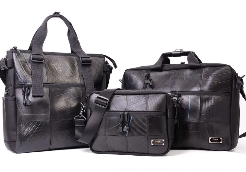 「SEAL」ブランドの新商品、『モザイクシリーズ』は、主要素材に大型トラックの使用済みタイヤチューブを特殊な加工をせずそのままの状態でリユース(再利用)しています。