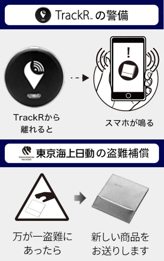 ご購入後1年以内に、万が一盗難等にあってしまったら、東京海上日動の保険*を適用し、新しい商品をお客様にお送りします。更に、TrackR,Inc.(トラッカール インク)ともコラボレーションし、スマートフォンでなくしたものを探せるデバイス「TrackR」がついてきます。財布やバッグがみつからない時に、スマートフォンのアプリを起動すると、TrackRが音と光で、商品のありかをお知らせします。