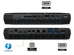 コンパクトなサイズながら、映像出力端子はHDMI(2.0a)×2ポート、Mini DisplayPort1.2×2ポート、Thunderbolt(TM) 3×2ポートの計6ポートを搭載しており、非常に充実しています。さらに本体前面にはVRヘッドマウントディスプレイに対応する接続ポートを集約しているので、VR環境に最適な構成となっています。
