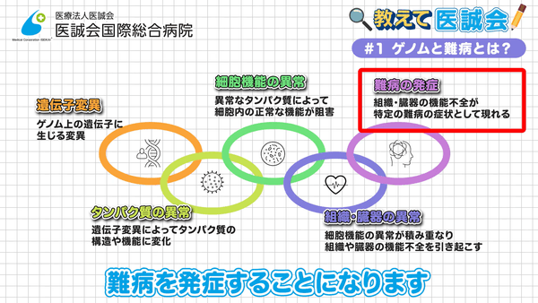 第1回動画では、難病の約8割がゲノムの変化によって発症することを踏まえ、成田 綾 医師がゲノムの役割と病気との関係を説明しています。ゲノムは体質や病気へのなりやすさを形づくる情報であり、変異が生じると、そこから作られるタンパク質の働きが変化し、細胞の機能に影響を及ぼすことがあります。この一連の流れを図解で紹介し、難病発症の背景を理解しやすい構成としています。